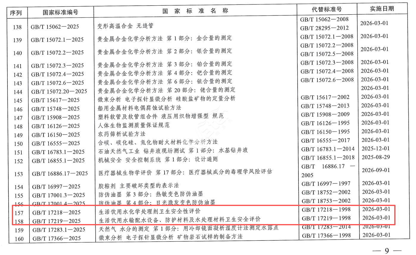 近日,國家市場監(jiān)督管理總局(國家標(biāo)準(zhǔn)化管理委員會(huì))批準(zhǔn)發(fā)布了《生活飲用水衛(wèi)生標(biāo)準(zhǔn)》(GB 5749-2022)兩項(xiàng)重要的引用標(biāo)準(zhǔn)《生活飲用水化學(xué)處理劑衛(wèi)生安全性評價(jià)》(GB/T 17218-2025 )、 《生活飲用水輸配水設(shè)備、防護(hù)材料及水處理材料衛(wèi)生安全評價(jià)》(GB/T 17219-2025),并將于2026年3月1日開始實(shí)施。